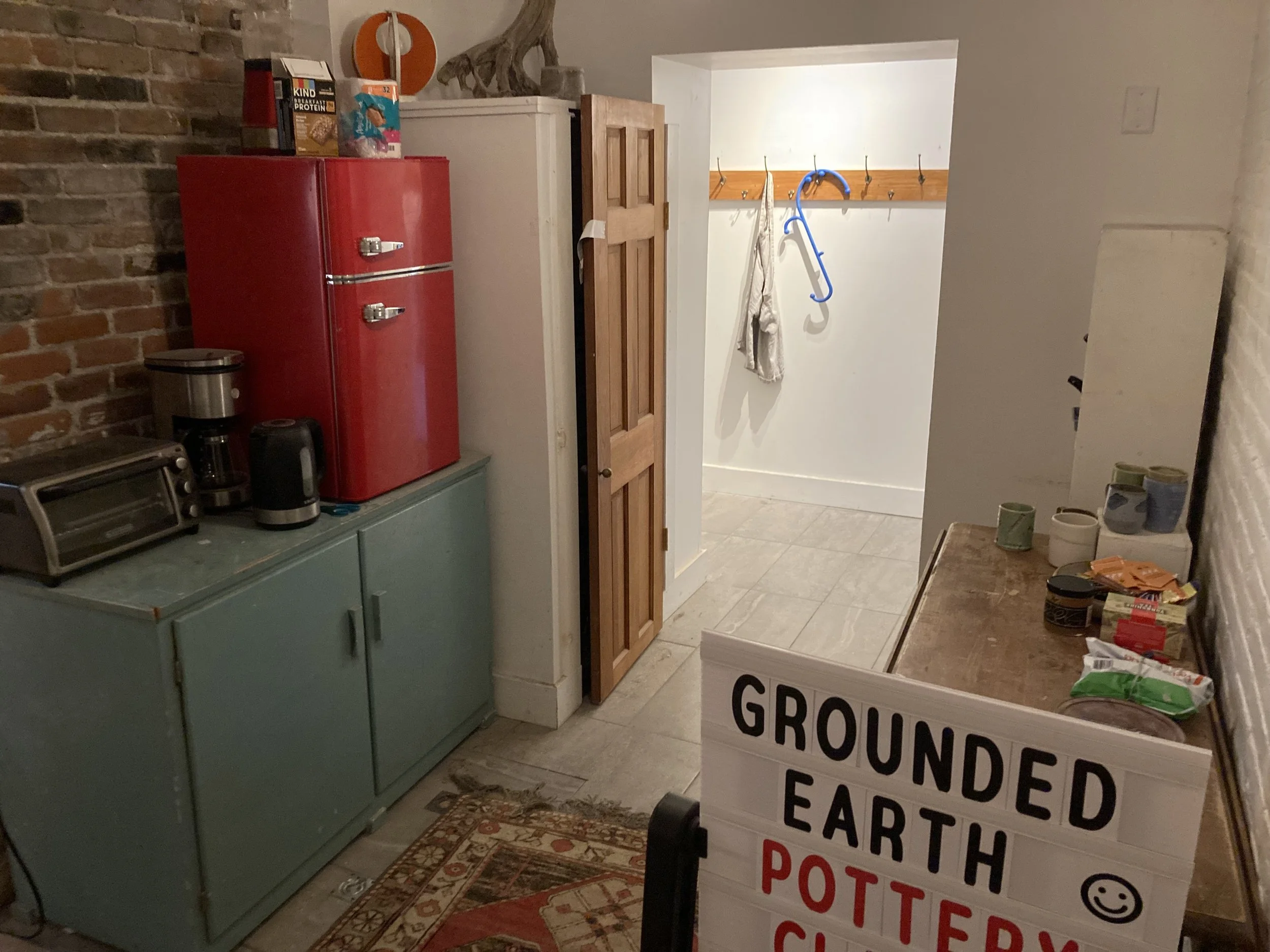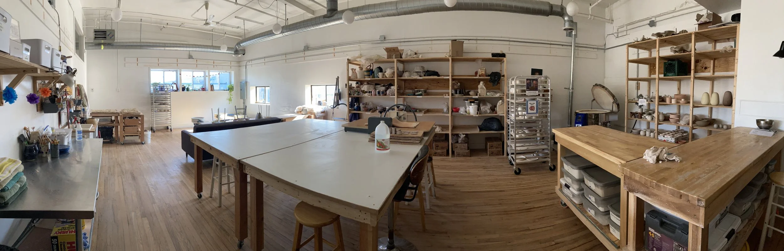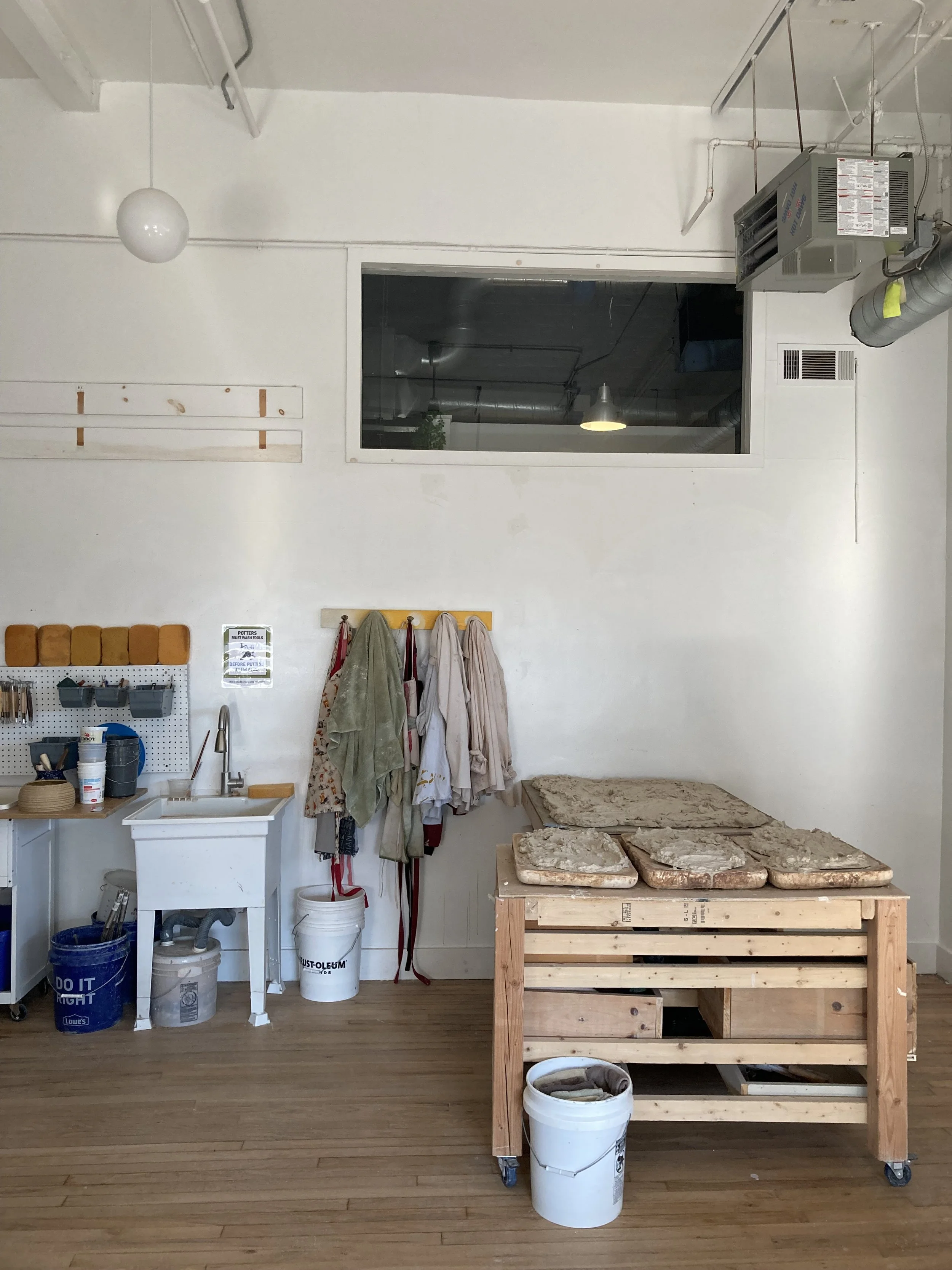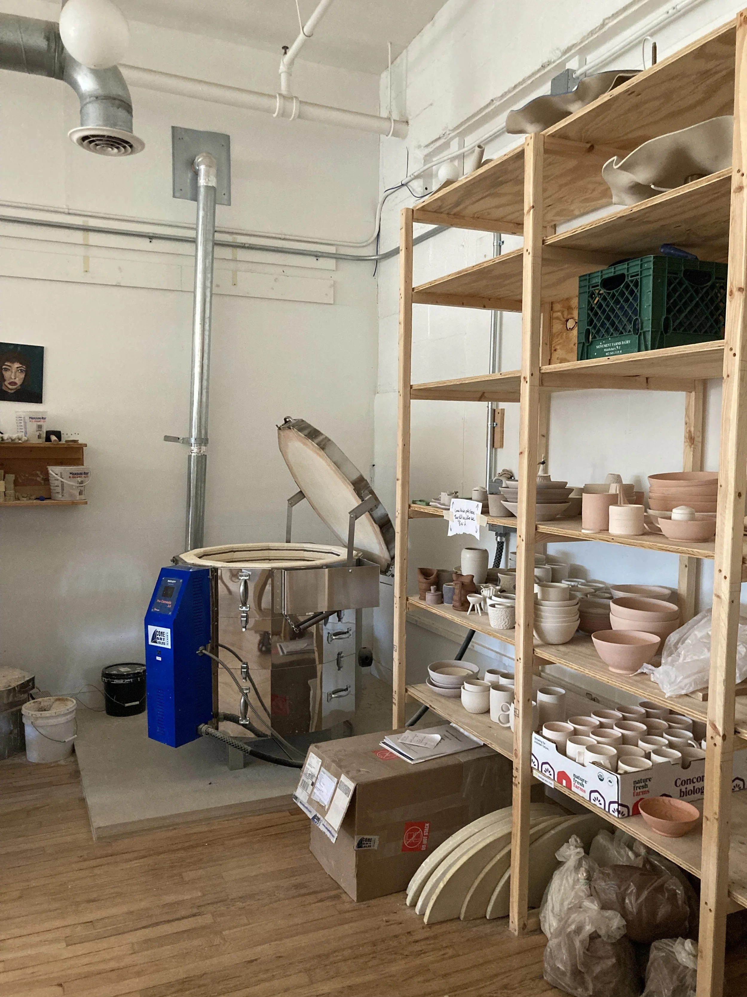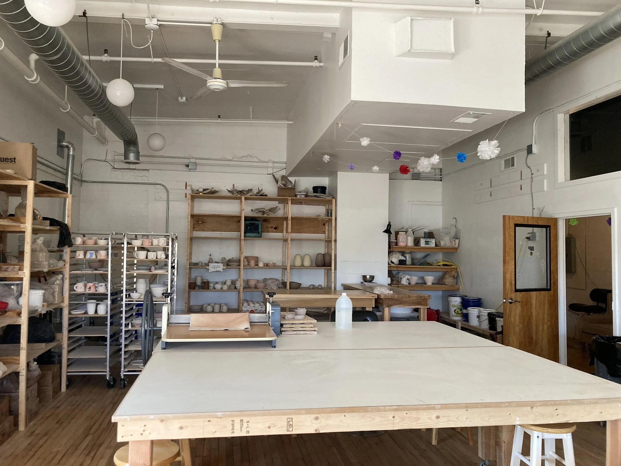 Our lovely studio is both spacious and cozy. With six wheels, a large handbuilding table, a slab roller, wedging stations, dedicated shelf space, and communal glazes, potters have everything they need. A comfortable couch and small kitchenette help keep you rested and fed while at the studio.